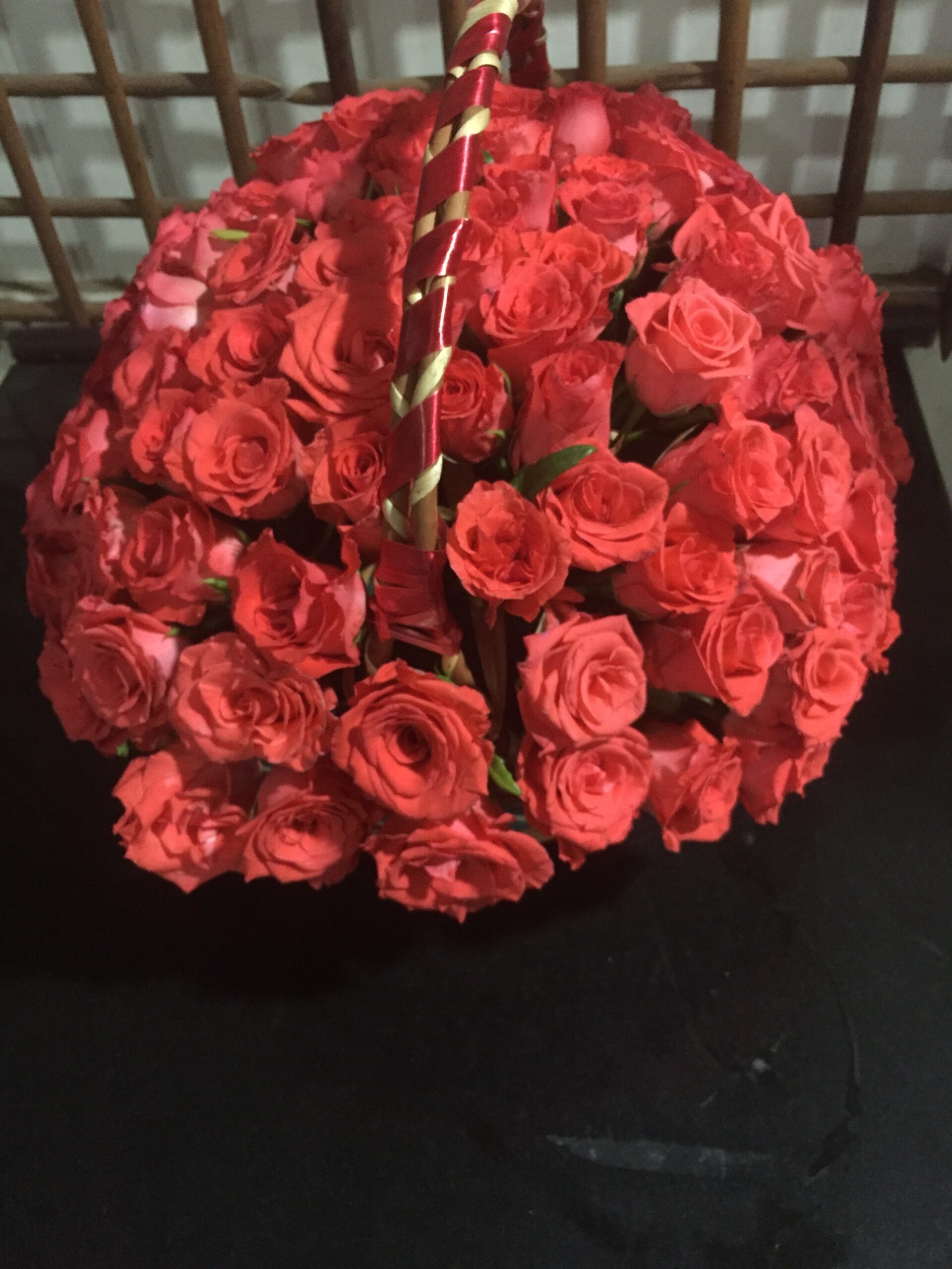 150 Roses arranged in an all round basket with a handle. For a basket with single colours, kindly place the order one day in advance, else only available colours or mixed colour roses will be used.
