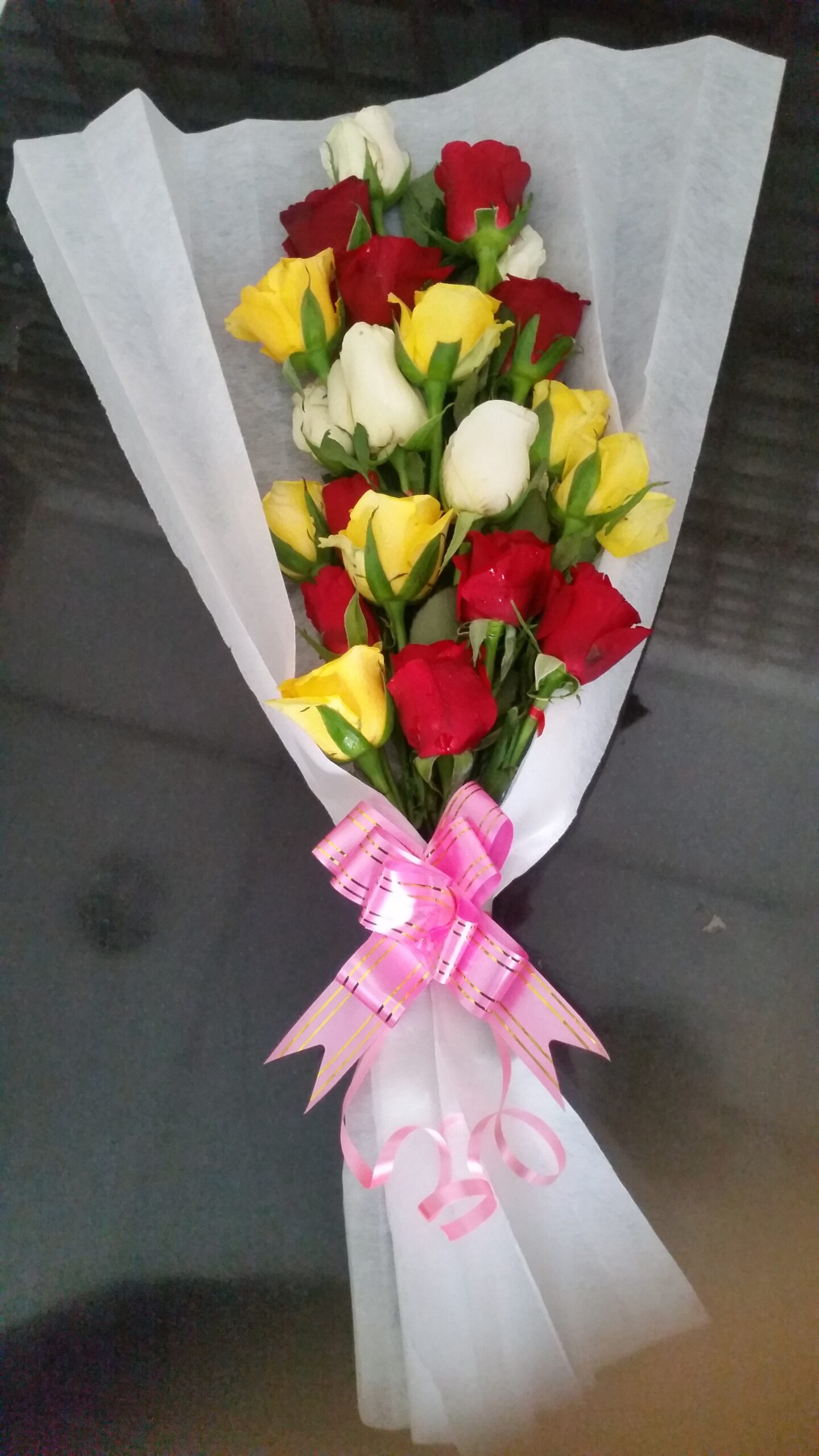 A wreath containing mixed flowers. If white flowers are available on date requested, the same will be used else available colour of flowers will be used. The flowers shown in the photo is indicative only.