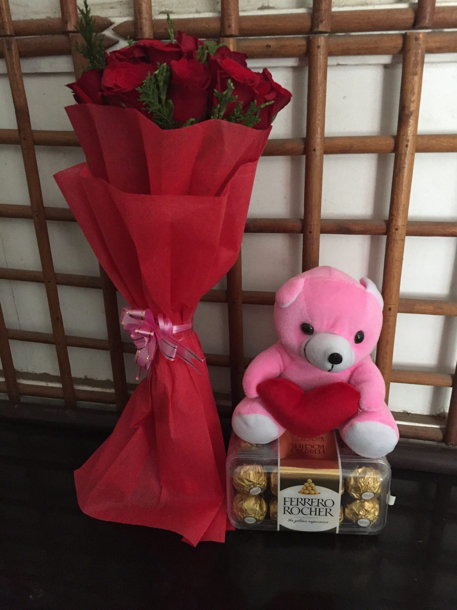 6 Roses bunch paper packed accompanied by a teddy and ferrero rocher chocolates.