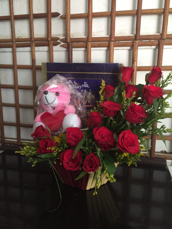 15 Red roses in a basket with a teddy and cadbury Silk chocolates gift pack