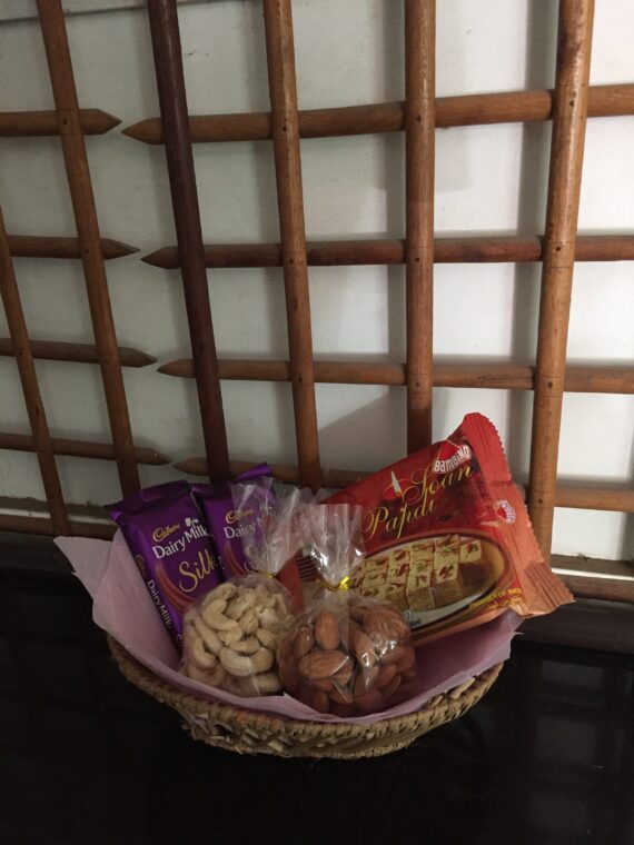 A basket of 2 silk chocolates with 100gms cashew, 100gms almonds and 250gm soanpapadi