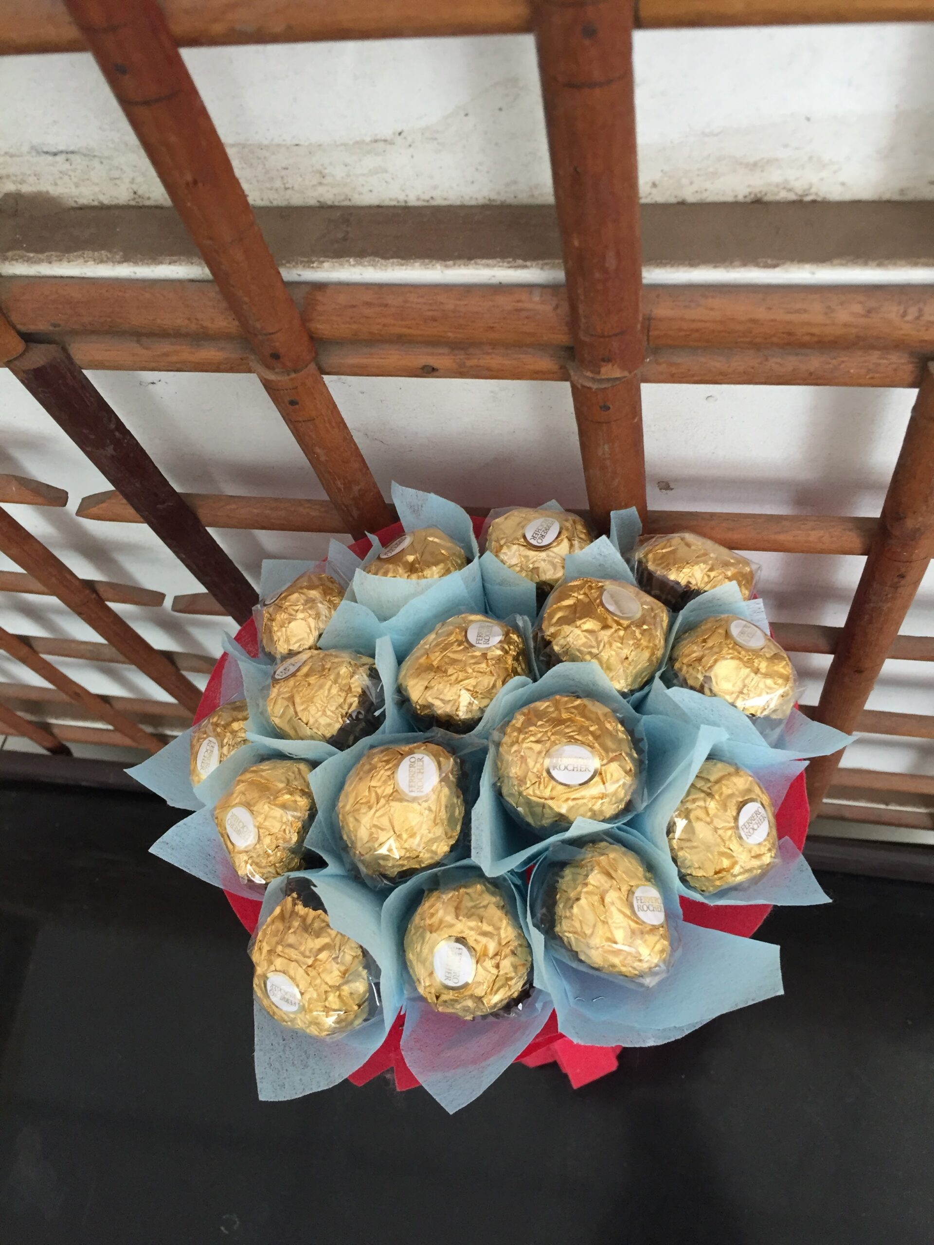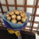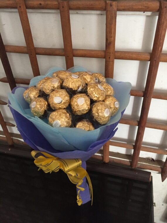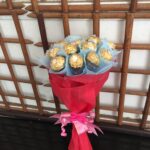 6 Red roses red paper wrapped with a box of cadbury celebrations chocolates.
