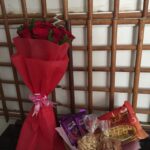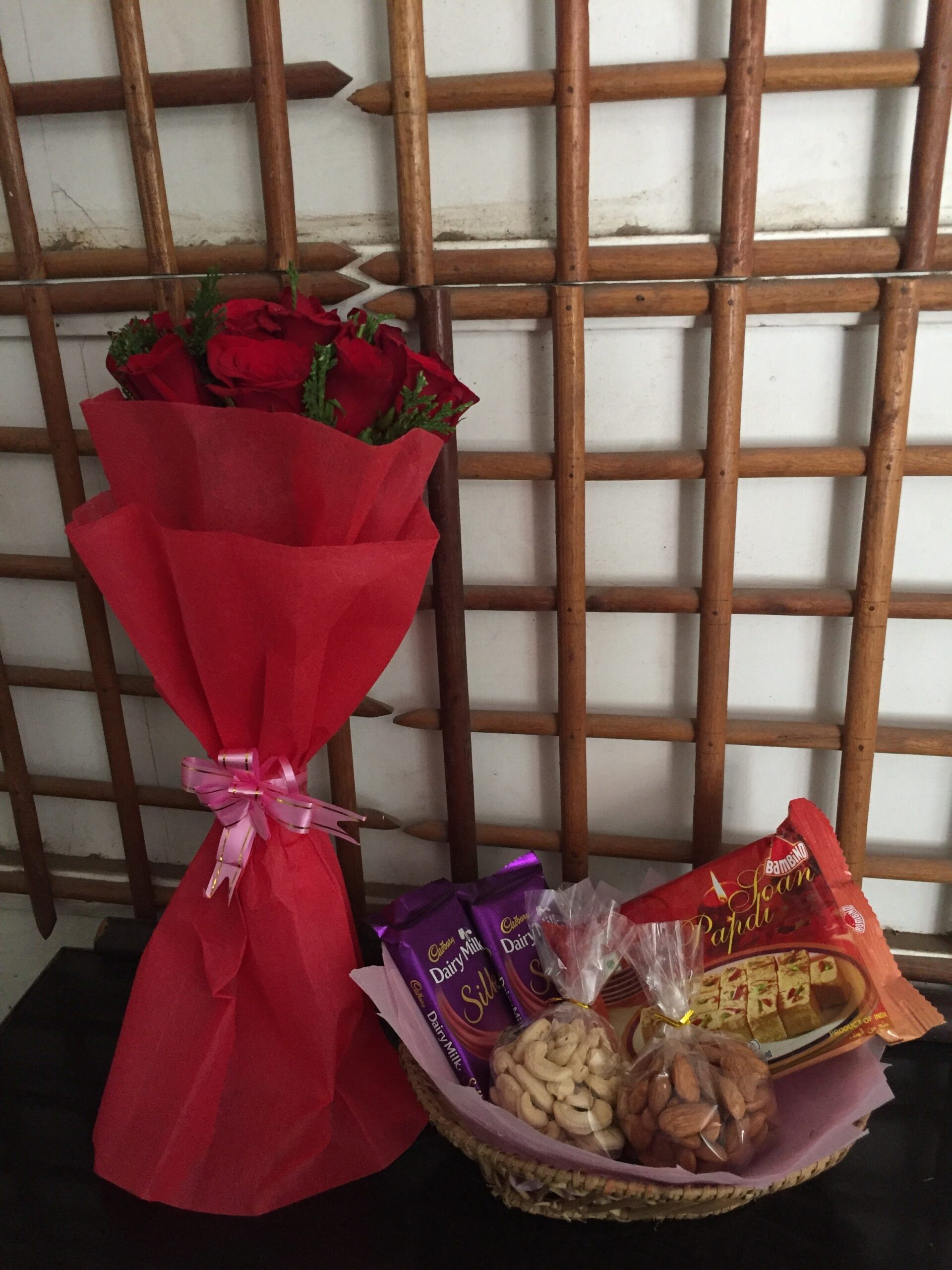 12 Red roses bunch red paper packed accompanied by a basket containing 2 silk chocolates, 100 gms cashew, 100gm almonds and 250gm Soanpapadi